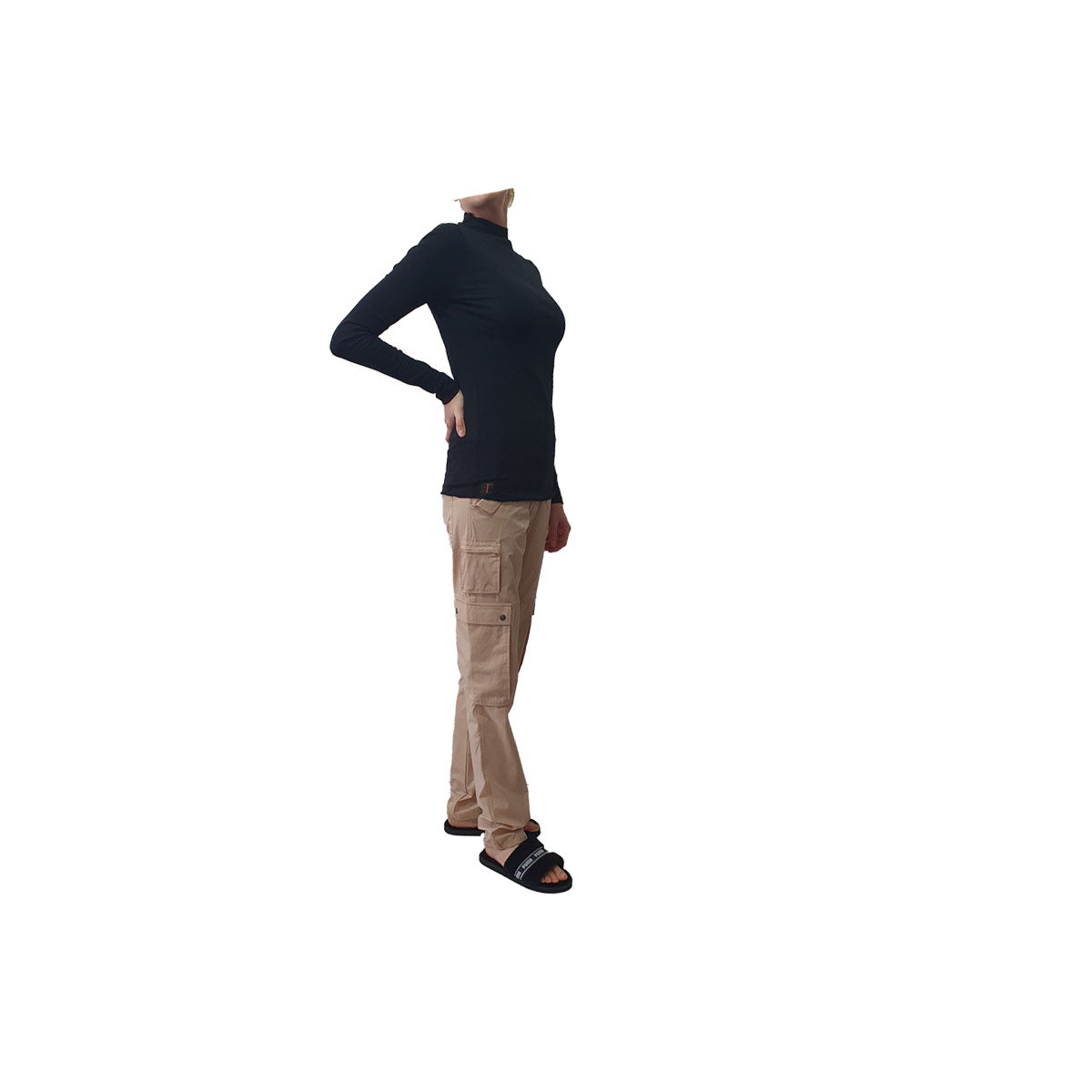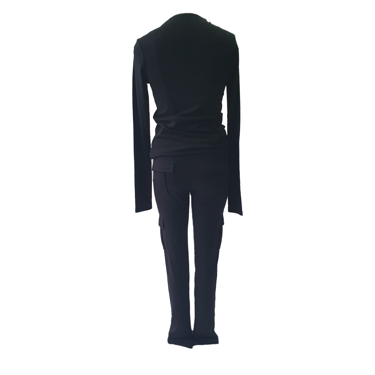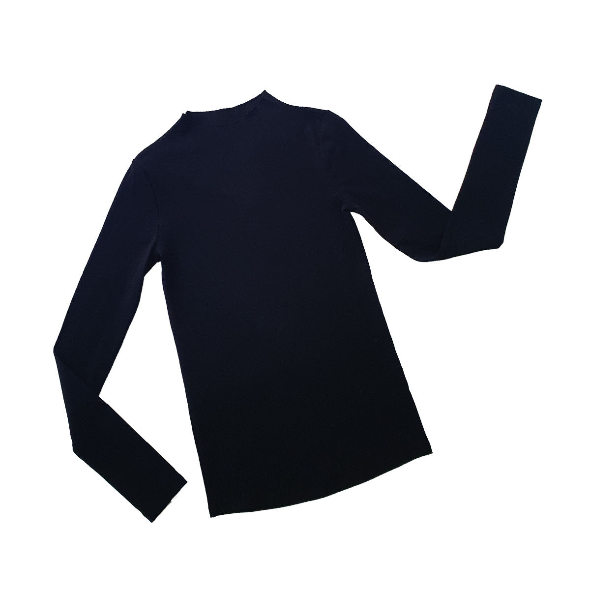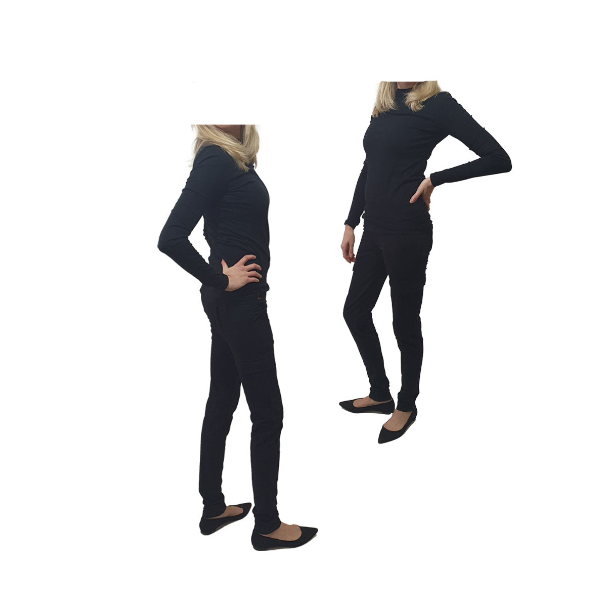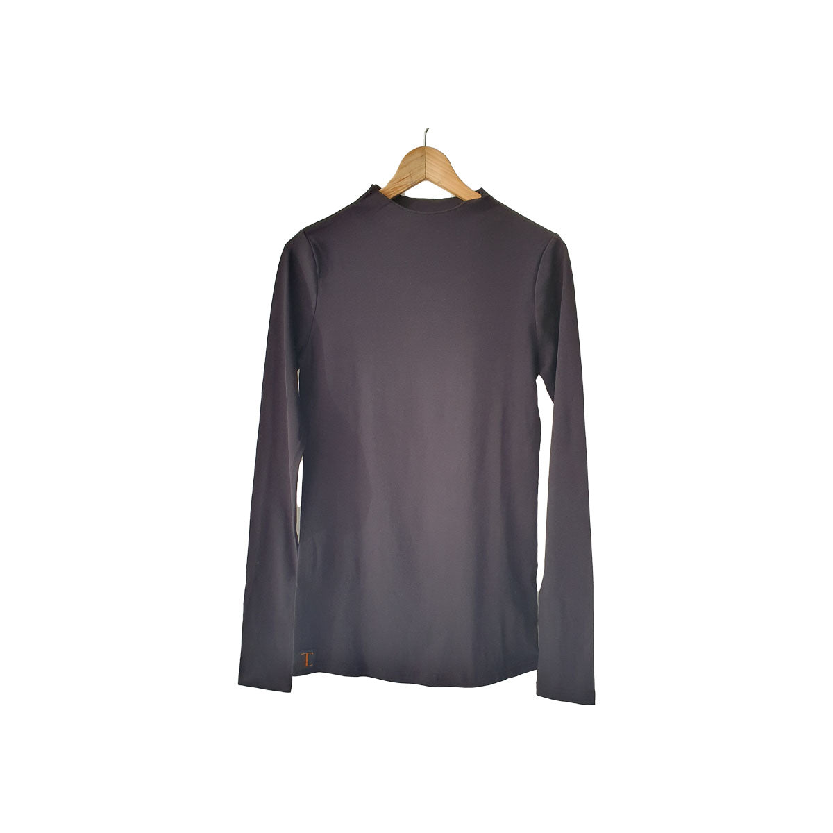 Black cotton/elastane long sleeve top, stretchy and comfortable. Black pip label on all sizes. Size up if you want a looser fit. Long body of 76cm for all sizes, and long arms at 90cm (measured from centre neck to cuff), don't miss out! Model is close to 6ft1 with long arms. She is wearing a size 10 and normally wears a size 10.